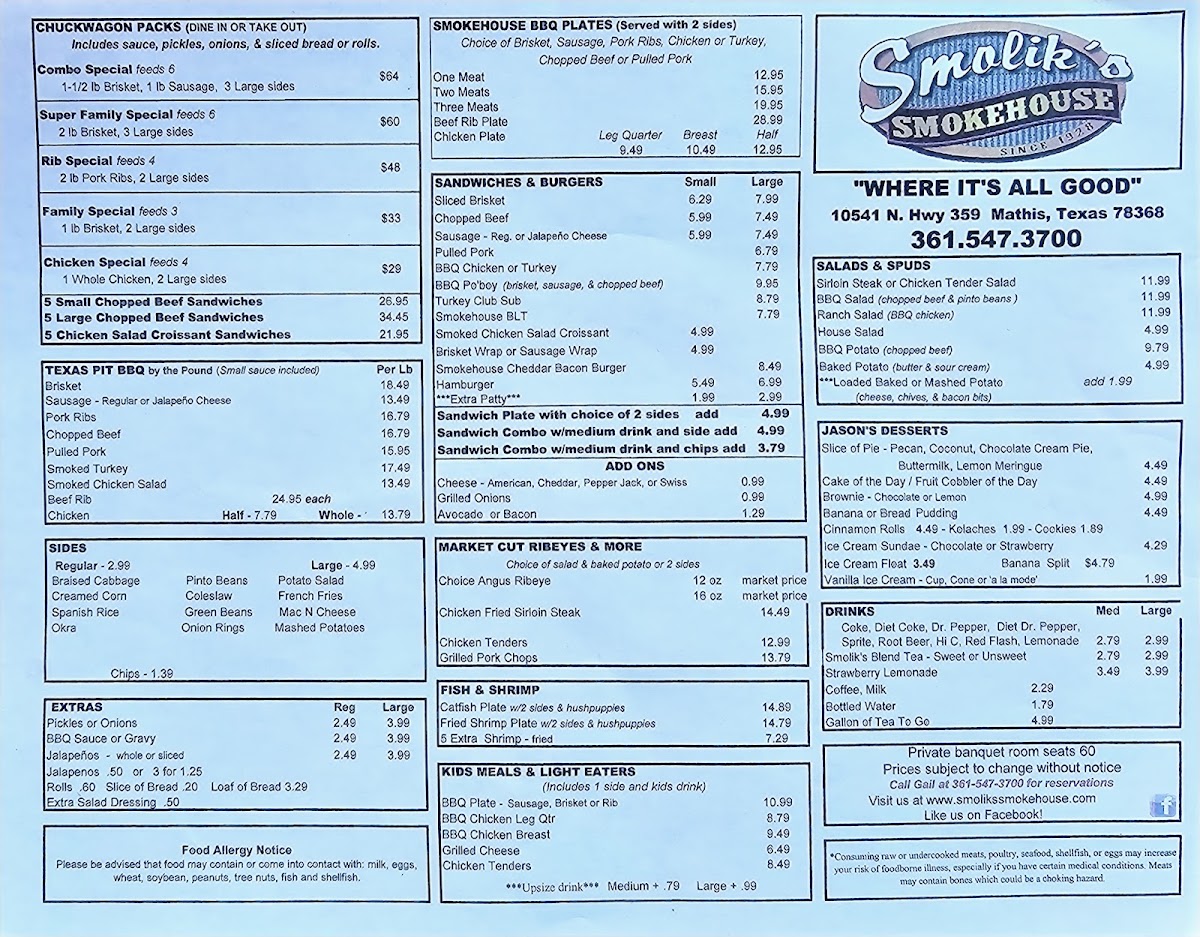 At Smolik's Smokehouse Menu, you'll find a delicious array of smoky, savory dishes that are perfect for any BBQ lover. Located in the heart of Mathis, TX, this place offers a cozy spot where you can indulge in some of the best smoked meats around. Whether you're craving tender brisket, juicy ribs, or a mouthwatering pulled pork sandwich, each item is cooked to perfection with that irresistible smoky flavor. The menu also includes flavorful sides like creamy mac and cheese, crispy fries, and tangy coleslaw, making it the perfect meal for both small and big appetites. Whether you're here for a quick bite or a relaxing meal with friends and family, Smolik’s Smokehouse has something to satisfy everyone’s taste. Make sure to stop by and enjoy a hearty, comforting meal that’s all about the smokehouse tradition.